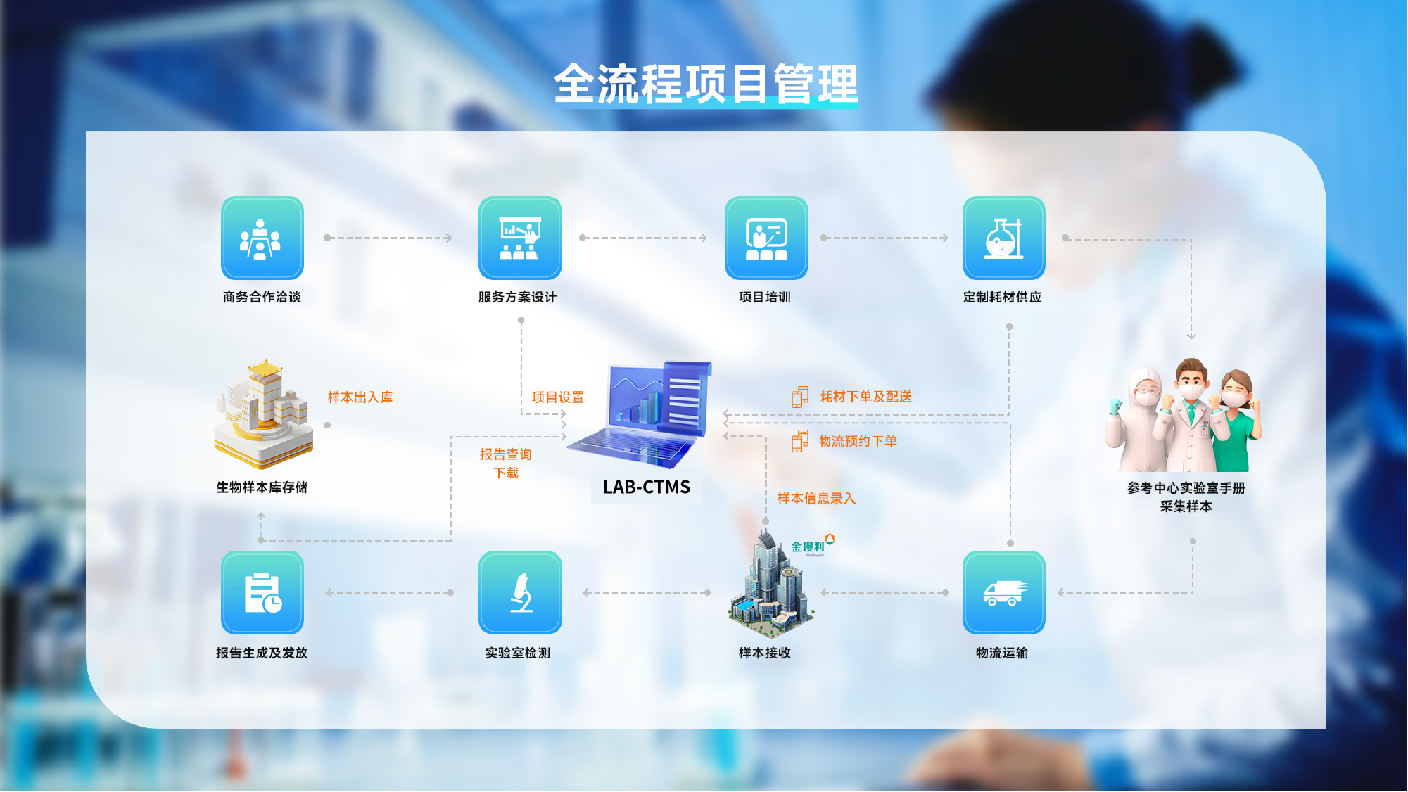 金墁利自主研发了实验室试验管理系统(LAB-CTMS),该系统贯穿临床项目的全生命周期,其包含临床项目前期对接,项目设置、定制耗材申请、物流运输管理、项目监督、生物样本管理,检测报告发放等模块,为各方合作伙伴搭建一个高效链接的桥梁,确保项目的实施的科学性、严谨性,还能及时反馈跟进项目的进展情况,确保各项工作的顺利开展,提高临床试验项目的质量和效率。